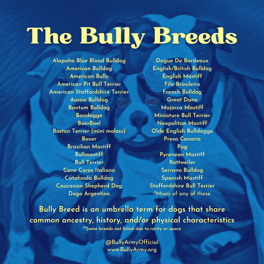 This list includes most of the breeds commonly referred to as "Bully Breeds". When possible/pertinent, best practices encourage referring to a dog by their specific breed.